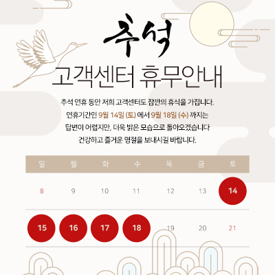 추석 연휴기간에는 일대일상담등 고객센터 업무가 어려우니 이용에 참고부탁드립니다.